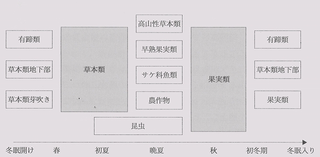 ヒグマ(以下、エゾヒグマをいう。)は、北海道の森林や原野に生息する。ヒグマの1年の行動形態を、模式的に示すと右図のとおりである。
