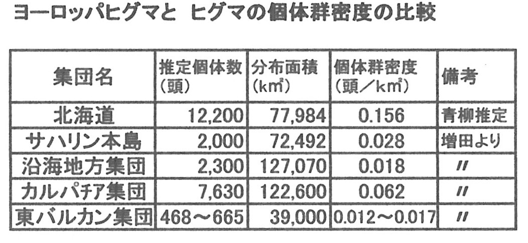 右図は、北海道本島のヒグマの生息密度と、増田氏の算定したヨーロッパヒグマの生息密度の高い地域の2集団、及びアジア東部のサハリン、沿海地方の生息密度を示したものである。
