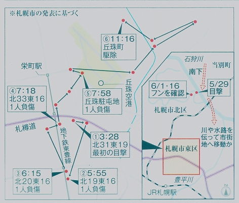 先のヒグマの市街地中心部への侵入ルートについて、ヒグマ研究家で知人のクマ博士間野勉氏は、東区は平野で山はない。約60kmも北の増毛山地に住む個体が、当別町を通り抜け、石狩川を渡り、茨戸川を遡り、その支流伏籠川を更に上り、途中これに注ぐ水路に入りそれを上り詰め、札樽道の高架線地点で水路が、覆土により地下水路(暗渠)となっている地点で地上に上がる。そこで早朝の通行人と遭遇し、ヒグマがパニック状態になり人を襲ったが、人を食べる意図はなかった、とみる。