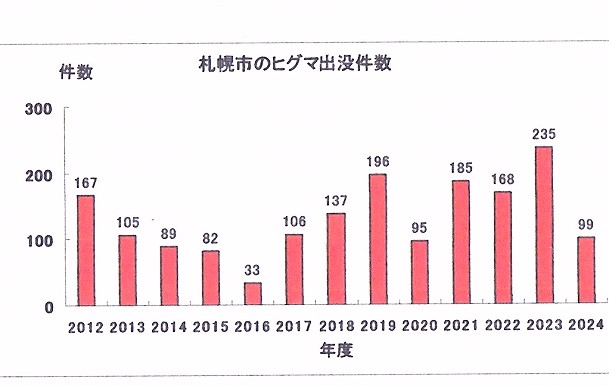 最近のヒグマの札幌市街地への出没件数は、図-4のとおりである。13年間の平均は131件で、最多は2023年の235件である。