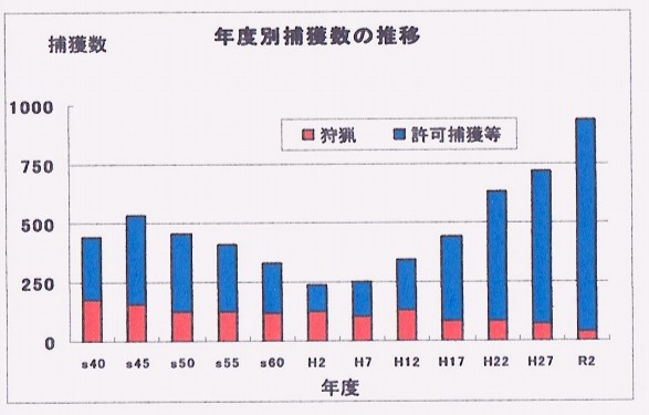 R5(単)年度は狩猟120頭、許可捕獲他1,684頭、合計1,804と異常に多い捕獲数となっている。