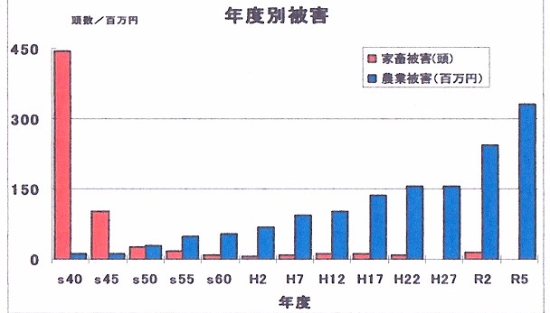 一方、農業被害額は年々増加し、令和にはいると2億円を超え、R5(単)年度は最多の3億3千万円となっている。最も被害額が多いのはデントコーンであり、次いでビートである。
