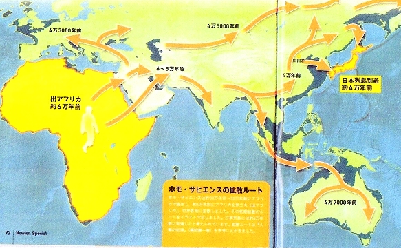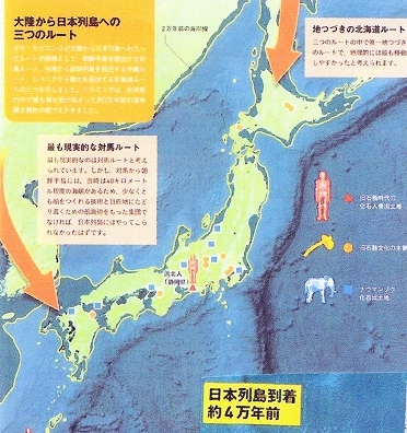 人類は全てアフリカで誕生し、今から約6万年前にアフリカを出たという。日本列島に人が住み着いたのは、今から約4万年前からだという。アジア経由で日本列島に北、中、南の3方向から入ってきた。その1つが地続きの北海道ルートである。今よりも海水面が70~80mも低く、これが地理的に最も移動し易かったという。これは日本の旧石器時代で、人々は石器を木の先につけた槍で、獣と戦いながら大陸から北海道に渡ってきた。トラやヒグマのいるユーラシア北部を2万年かけて横切り東に向う。マンモスを追っていたのであろう。しかし、この間、トラやヒグマ、ヒトは滅びず、マンモスだけが滅びている。