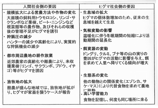 以上を「人間社会側の要因」と「ヒグマ社会側の要因」に分けて下表に纏める。
