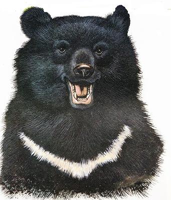 - ツキノワグマ。胸に白い三日月型の斑紋。