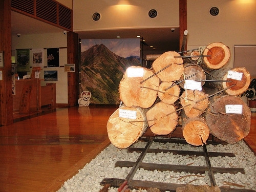 - 館内の展示の風景。馬鉄により地元産のスギ、ヒノキ、サワラ、モミなどが運び出されていた。奥が、白籏さんの山岳写真の展示場。