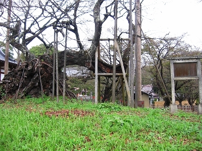 - 太い柱で支えられて建つ、神代桜。日本3大桜の1つ。
